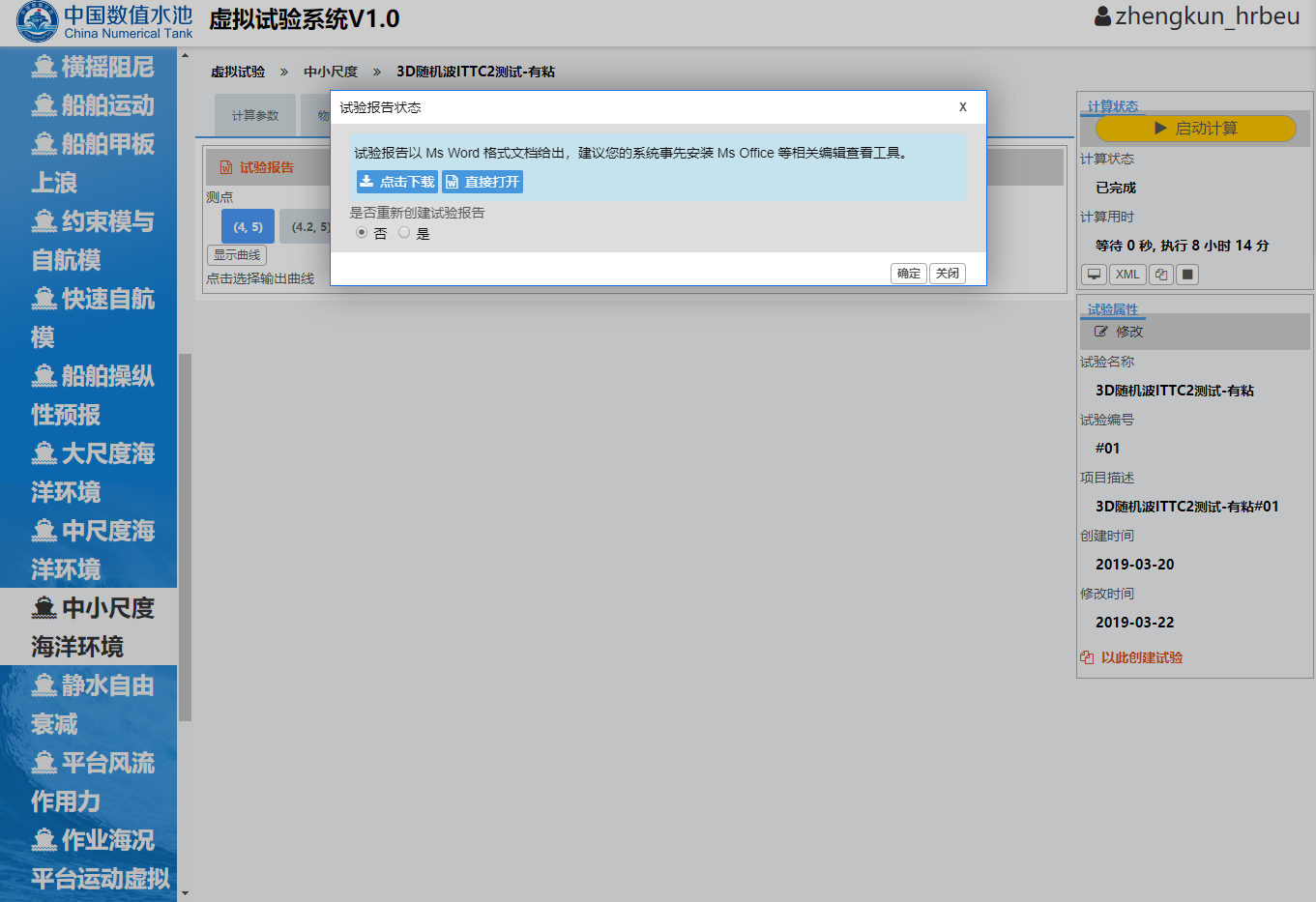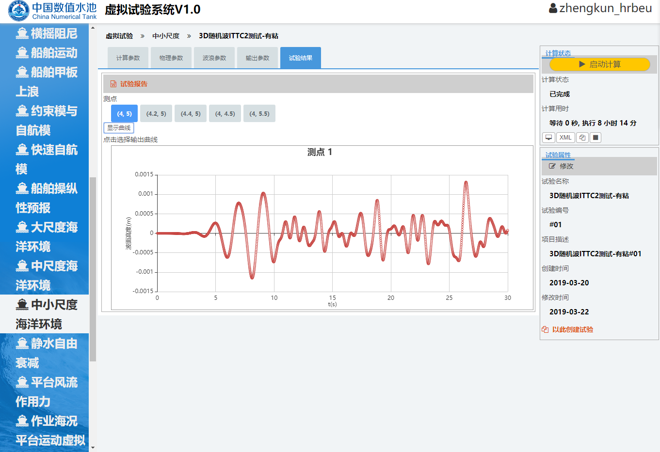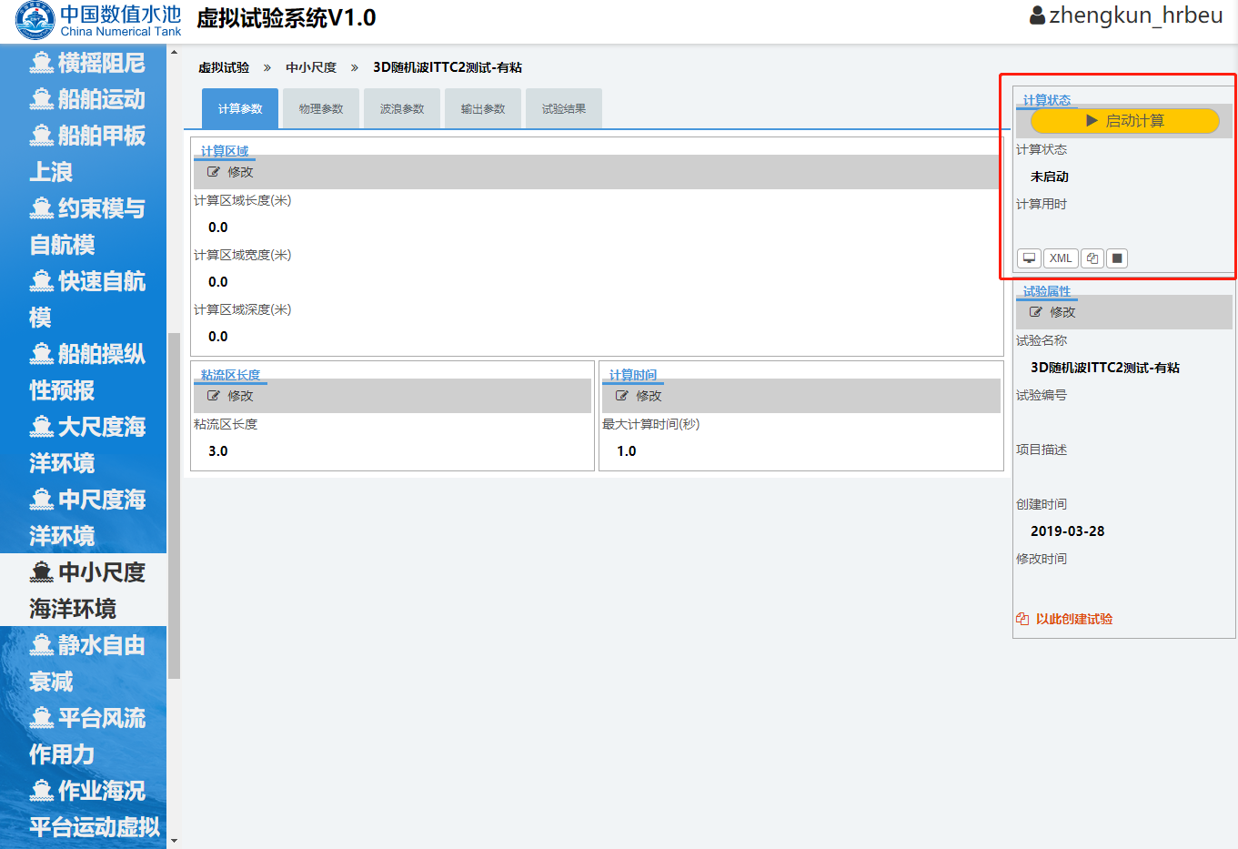 开始试验用户登录中国数值水池虚拟试验系统后,可完成系统提供的各类虚拟试验。虽然试验在参数、求解器、计算结果等方面区别很大,但总体上来说操作过程基本相同,主要由四个部分组成:1试验创建;2参数录入(前处理);3计算求解;4结果展示(后处理)。下面以“样例-中小尺度-三维随机波”为例进行详细介绍。