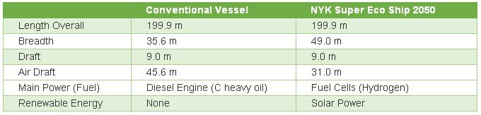 这艘概念船以汽车运输船为模型建造。通过改造船体减少水摩擦、降低船体重量、引入用于电力推进的燃料电池并依赖其他高效推进设备,运营船舶所需的动力减少了70%。船舶动力将来自于太阳能和可再生能源产生的氢气,而非化石燃料。这些设计将使二氧化碳排放量削减100%,从而实现船舶零排放。