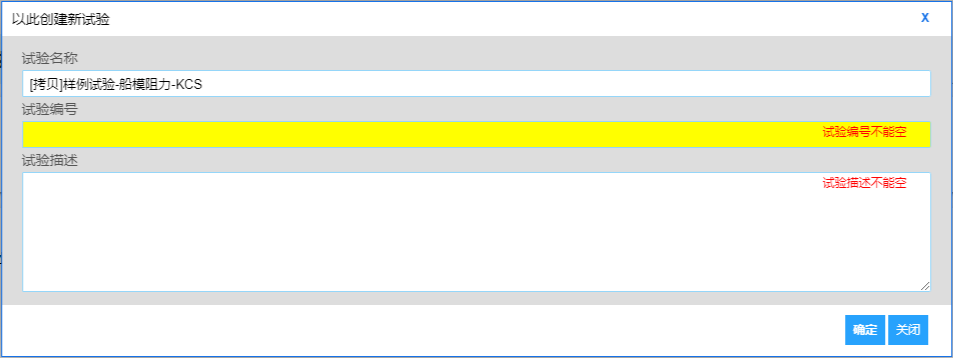 点击图3.2中的绿色按钮“以此创建试验”,网页上会弹出新的对话框,提示用户输入新建试验的相关信息,如图3.3所示。通过这种方式创建的新试验是样例试验的一个拷贝,其参数与样例试验相同,用户只需按实际情况修改部分参数即可。因此,可将样例试验看成试验模板,起到初始化试验参数的作用,推荐通过该方法创建新试验,如图3.4。