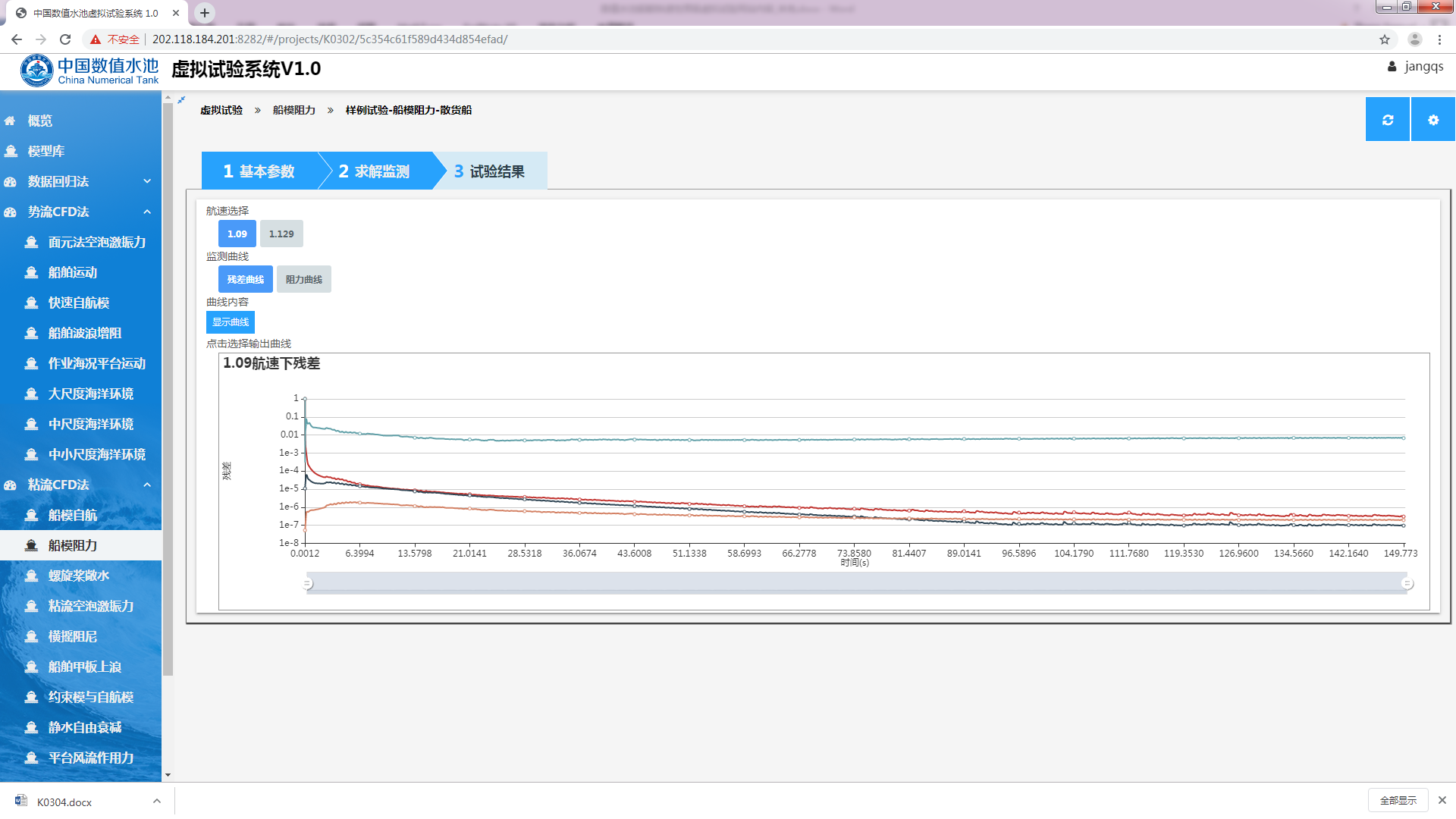 计算启动,用户可以通过“求解监测”标签来实时的查看当前虚拟试验的计算状态,如显示单个航速下的残差曲线(图3.11)、单个航速下的阻力曲线(图3.12)、多个航速下的阻力曲线(图3.13)。