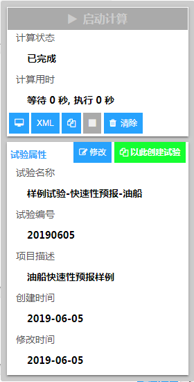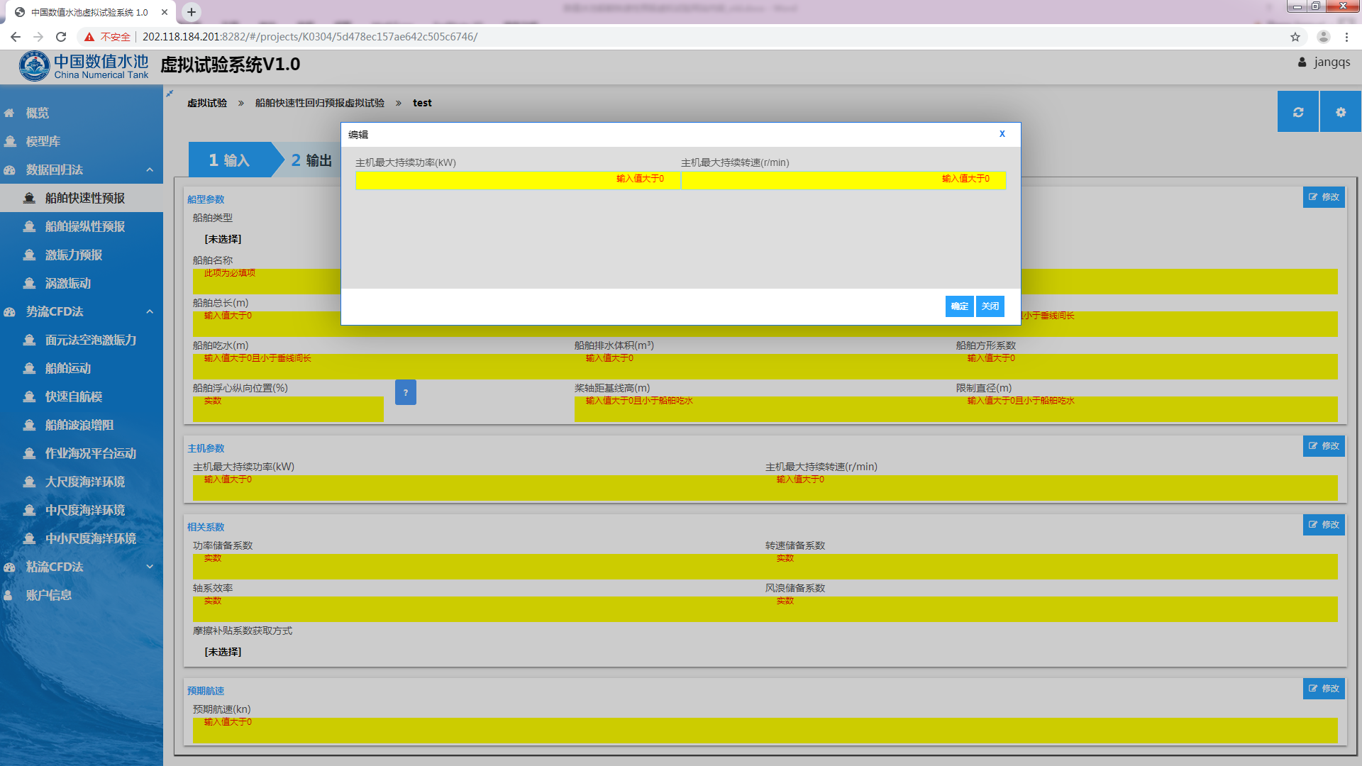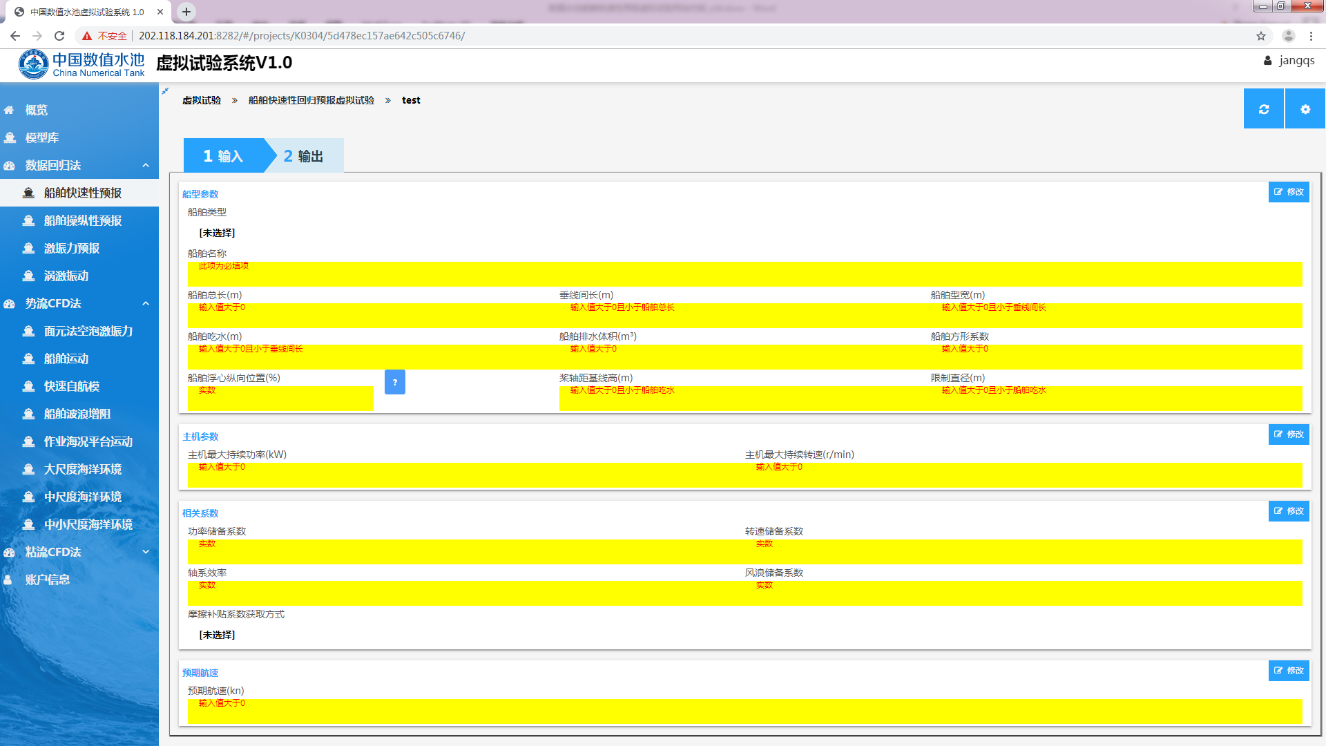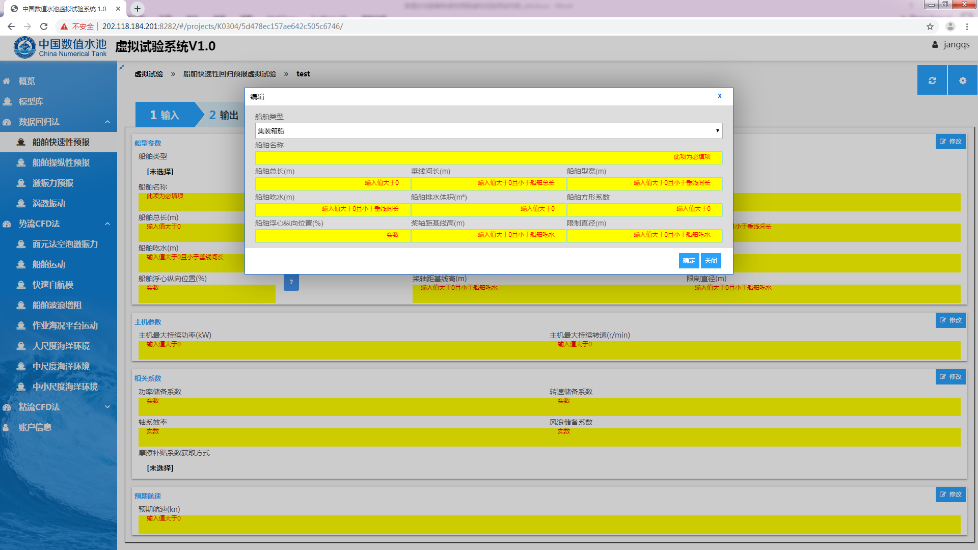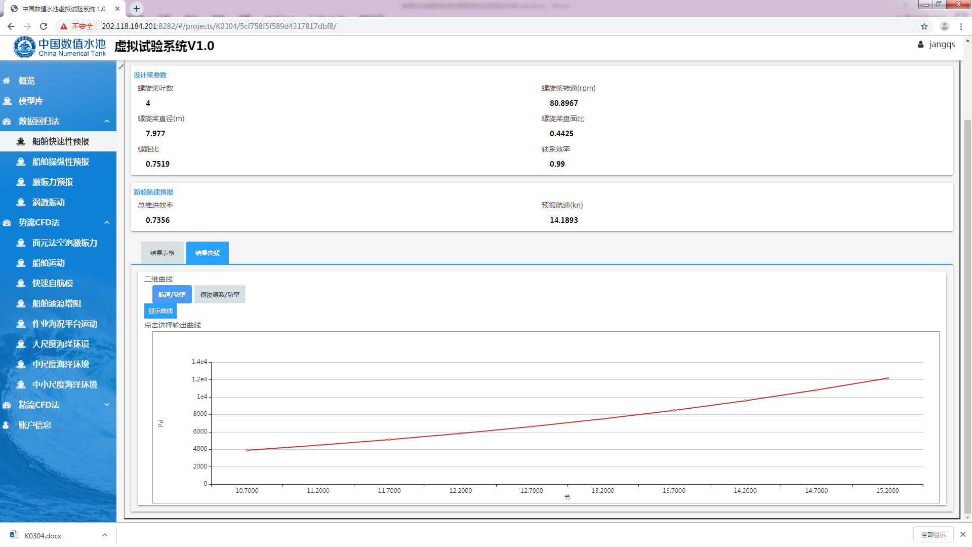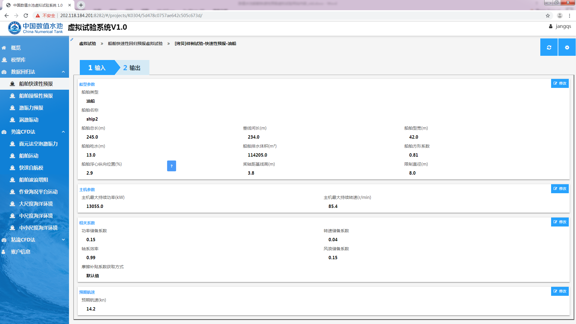 开始试验船舶快速性预报虚拟试验是船舶快速性子系统研发项目中一个虚拟试验,该虚拟试验用于船舶设计初期,根据船型主尺度及主机参数评估航速性能指标。系统对数据的处理与模型试验类似,不同之处在于参与计算的数据由回归分析得到,包括阻力及自航因子。其中阻力的回归目标参数为剩余阻力系数,自航因子的目标参数包括伴流分数、推力减额及相对旋转效率。配合螺旋桨设计,即可得到实船快速性能预报。