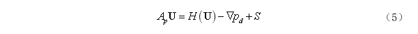在方程(3)中等号左端项均是以速度U为未知量的项。等号右边为压力梯度和源项。将方程(3)经过有限体积法(FVM)离散之后,可以得到以下形式: