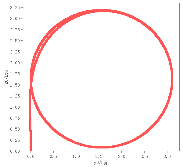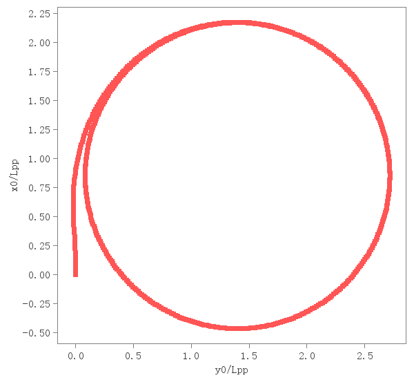 回转试验进行了舵35°试验。试验中给出了船舶重心点运动轨迹和回转中的战术直径、回转直径、纵距并给予相应的检验。