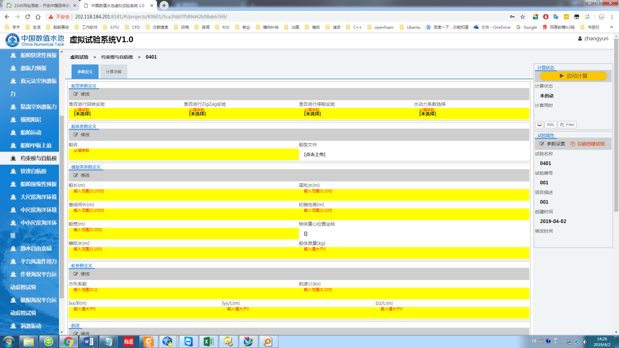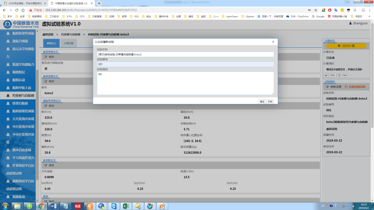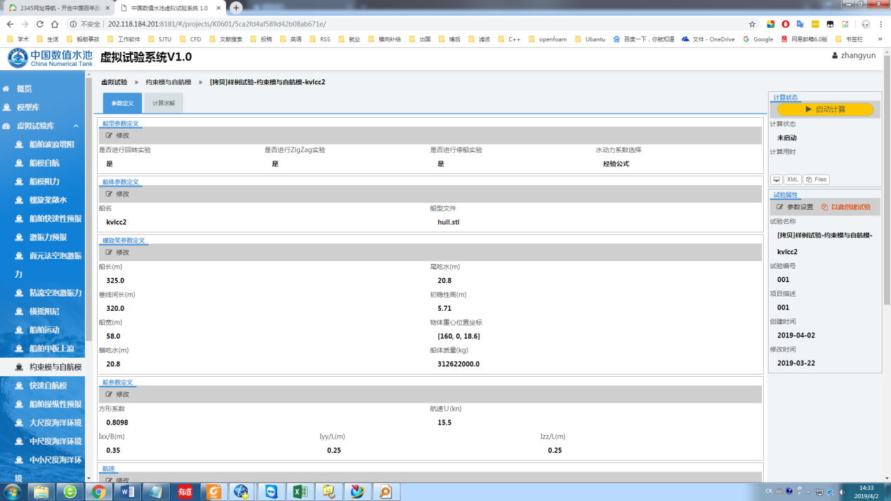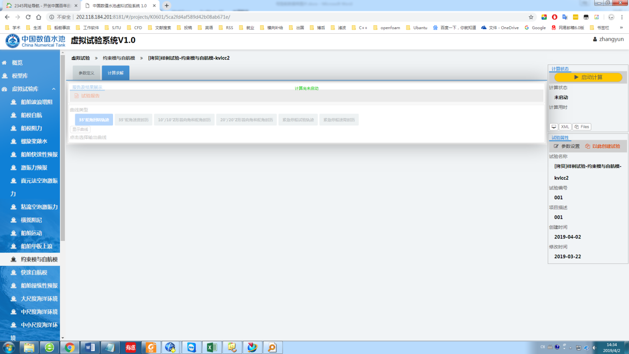 开始试验用户登录中国数值水池虚拟试验系统后,可完成系统提供的各类虚拟试验。虽然试验在参数、求解器、计算结果等方面区别很大,但总体上来说操作过程基本相同,主要由四个部分组成:1试验创建;2参数录入(前处理);3计算求解;4结果展示(后处理)。