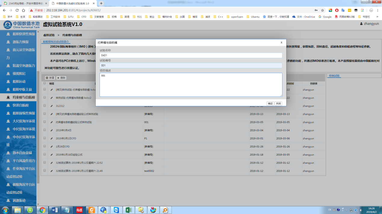 登录系统后,点击页面左侧导航栏中的“船舶操纵性”,从而进入该试验的管理页面。如下图所示,该页面有关于船舶操纵性预报的主要功能介绍,以及该虚拟试验的相关特色,其下为“我的试验”。
