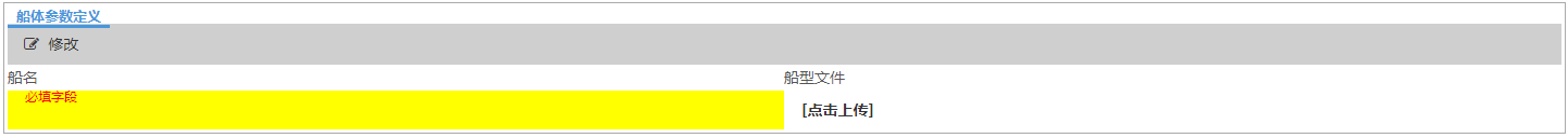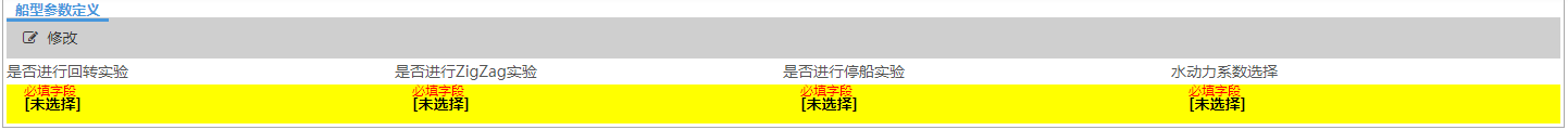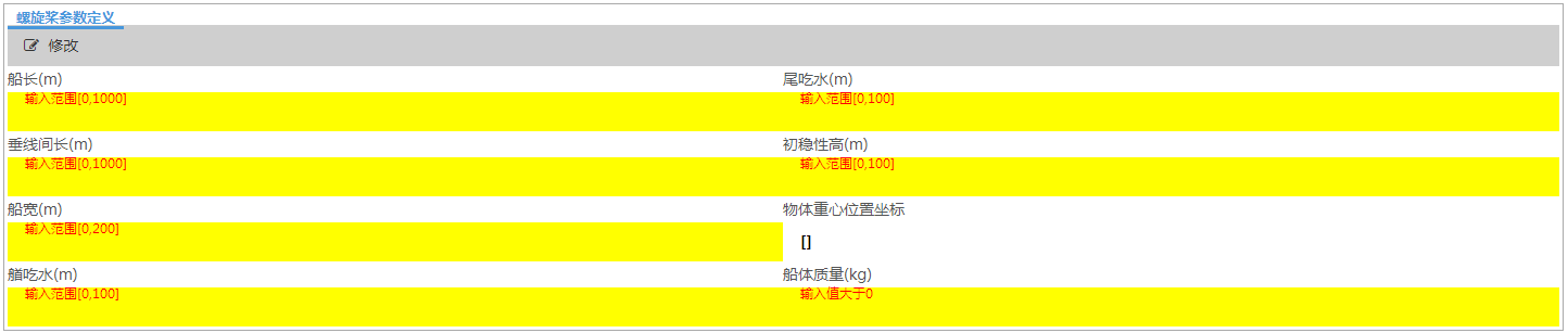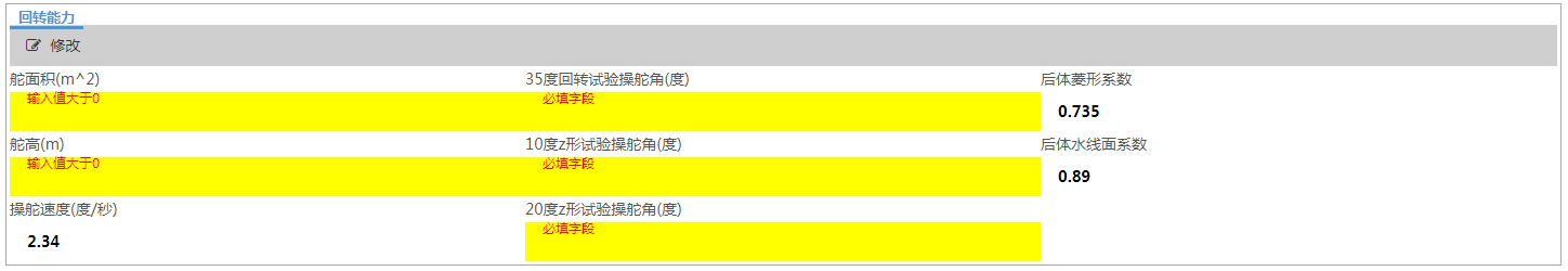 在“输入”标签中,点击“船型参数”小标签下方的“修改”按钮,可进入如下图所示页面,可以进行与船型相关参数的设置。按照所提示的信息输入正确的船型参数。其中船舶类型为下来菜单,不需要用户输入,其余参数都需要用户手动输入。