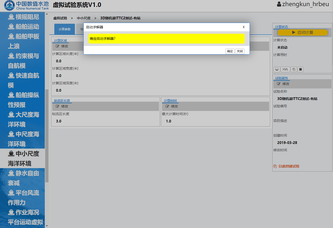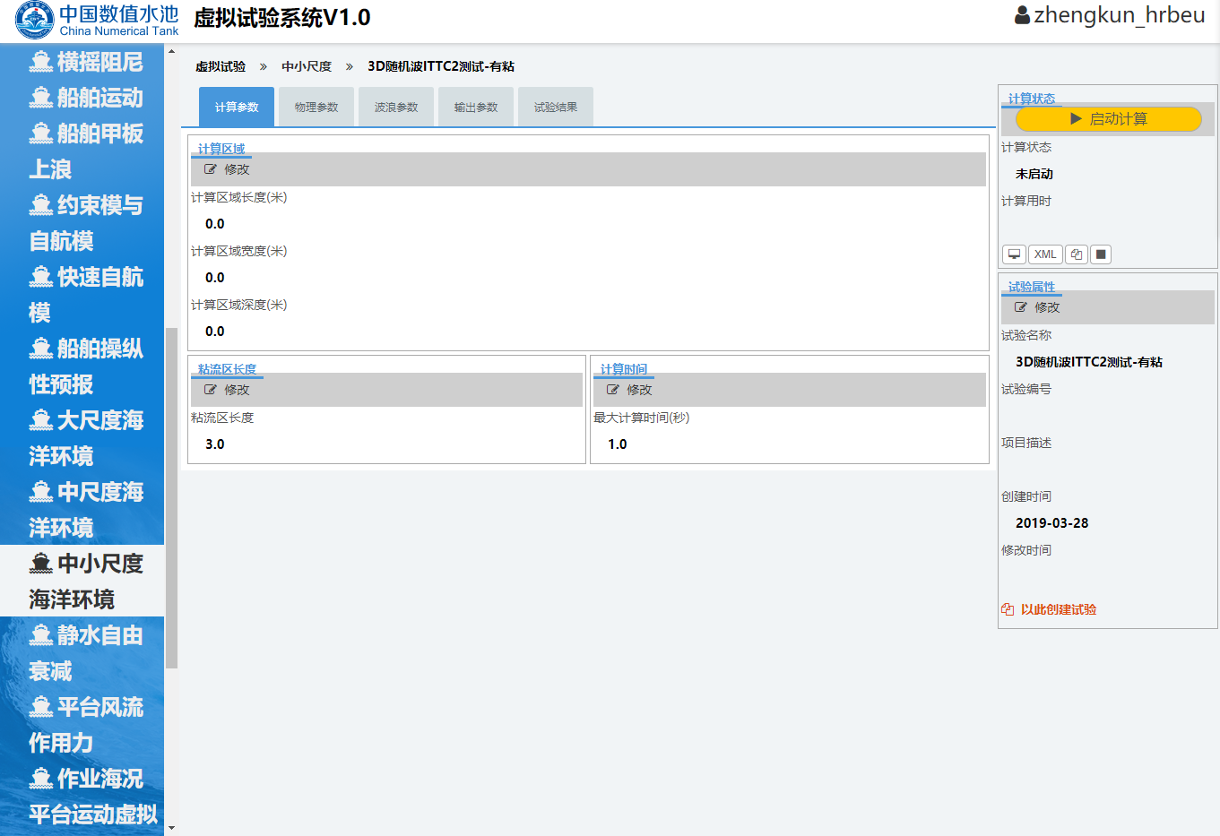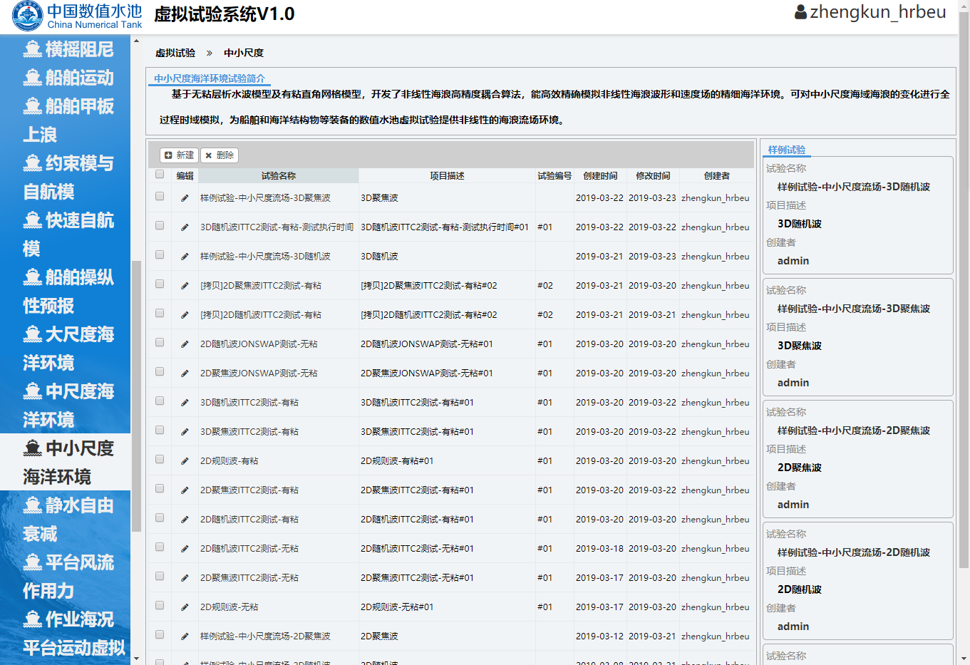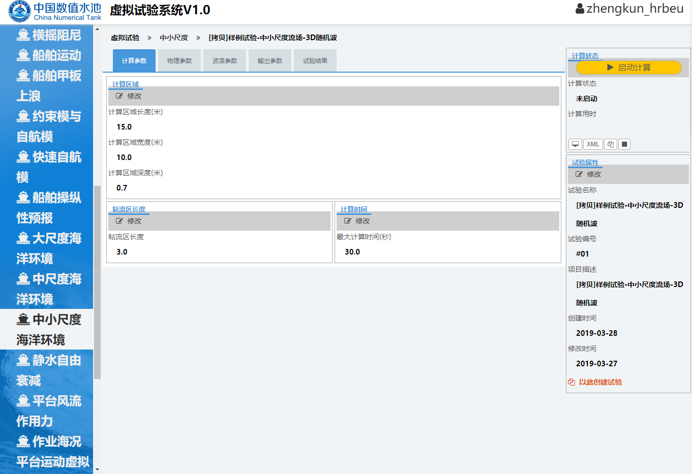 开始试验用户登录中国数值水池虚拟试验系统后,可完成系统提供的各类虚拟试验。虽然试验在参数、求解器、计算结果等方面区别很大,但总体上来说操作过程基本相同,主要由四个部分组成:1试验创建;2参数录入(前处理);3计算求解;4结果展示(后处理)。下面以“样例-中小尺度-三维随机波”为例进行详细介绍。