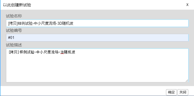 当一个新的虚拟试验创建口,用户需要对其参数进行适当的录入或修改,为确保结果的准确,请确认所录入的参数符合实际情况。一个虚拟试验可大致分为文件型参数、单数值型参数、表格型参数几种类型,下面以“样例-中小尺度-三维随机波”为例,介绍一下各种类型参数的录入方式。