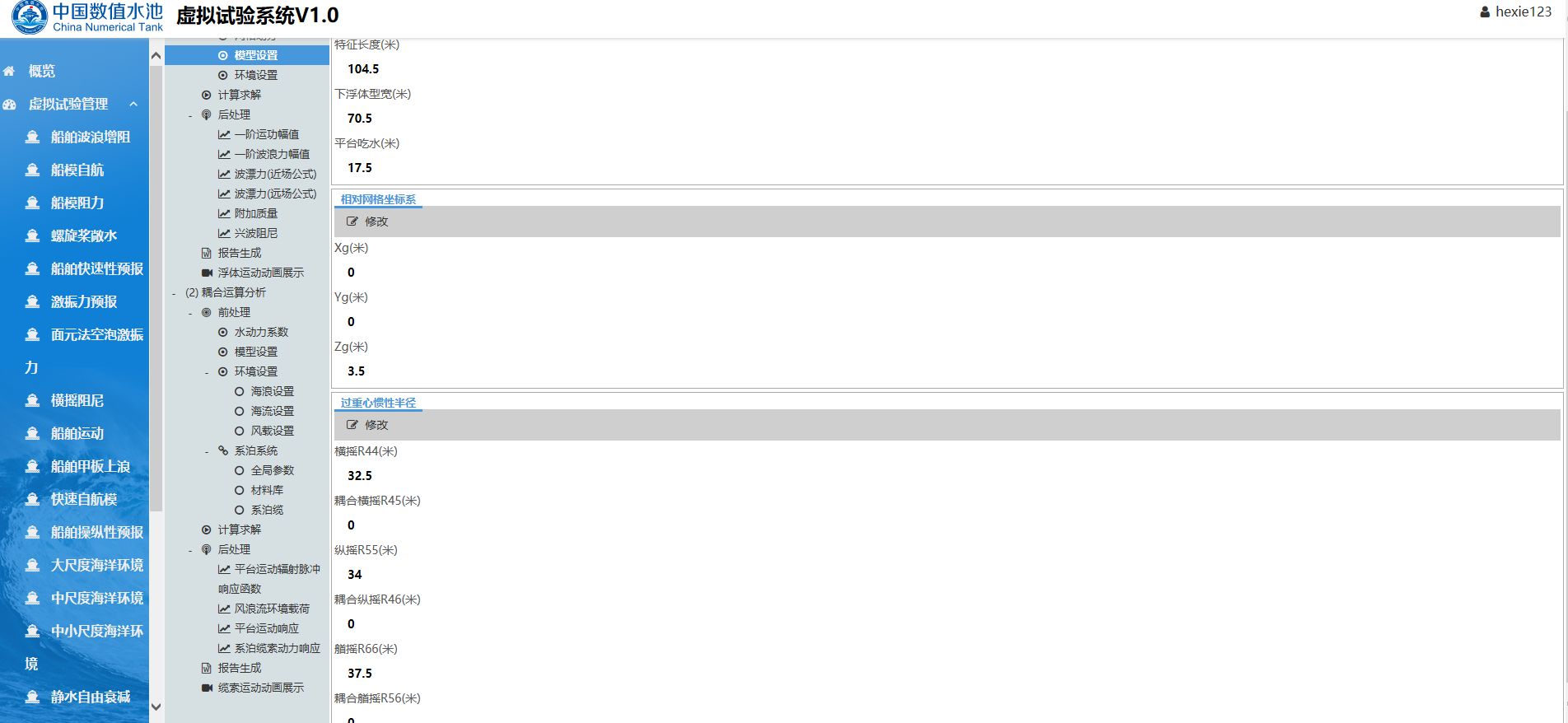 开始试验采用三维频域势流理论进行浮体水动力和摇荡运动统计分析;计算浮体的低频漂移等运动响应和系泊缆索动力载荷,由此评估系泊浮体水平低频慢漂运动和系泊缆索载荷;通过上述分析获得的浮体运动性能和系泊缆载荷可用于半潜式平台作用海况下作业衡准评估和系泊系统安全性评估。
