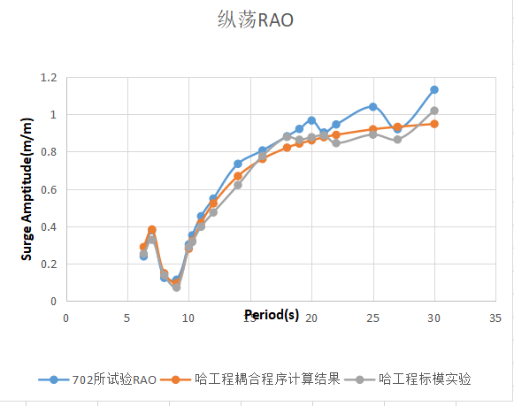 关于水动力参数的计算,控制模型和网格的绘制误差,得到的规则波中运动RAO与模型试验误差在10%以内;耦合分析运动中,通过调整缆绳的分段数,莫里森杆件的计算方式等等,基本达到精度要求(系泊状态下水平位移有义值计算结果与标模试验相比,误差在20%以内,系波缆受力计算结果最大值与标模试验数据相比,误差在20%以内)。