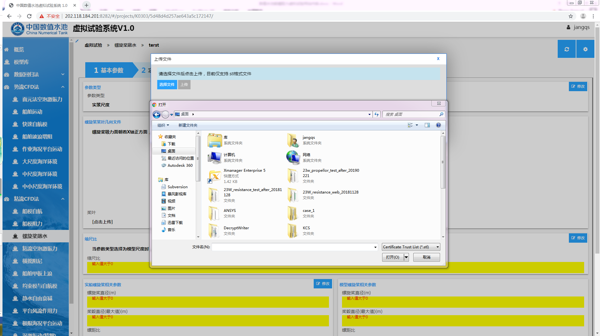 新的虚拟试验创建后,用户需要根据实际情况修改或录入船型相关参数,并确认所录入的参数符合实际情况。点击页面中的“基本参数”标签,即可进入参数设置页面,如图3.7所示。其中,螺旋桨桨叶需要用户自行上传,同时需要注意保证全局坐标系的一致:螺旋桨吸力面朝着X轴正方向,旋转轴与螺旋桨参考线相交于坐标原点。