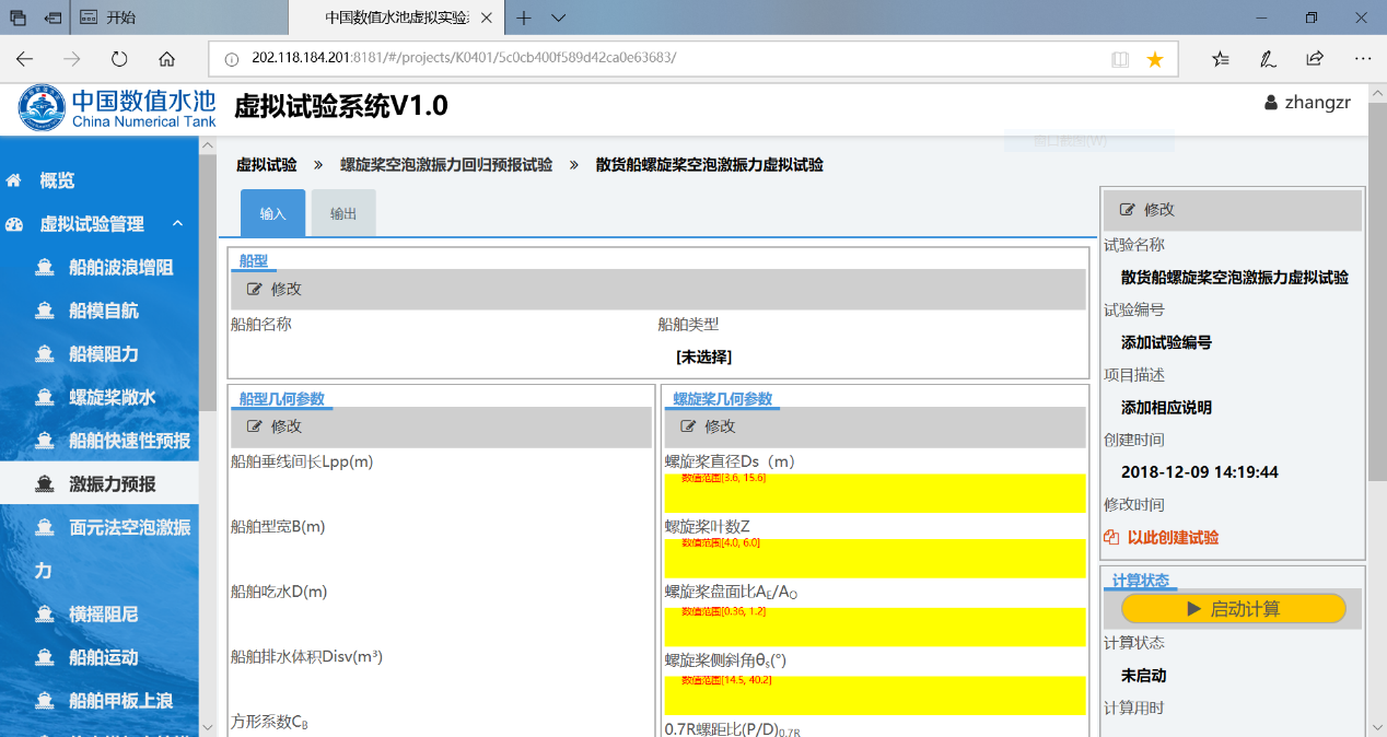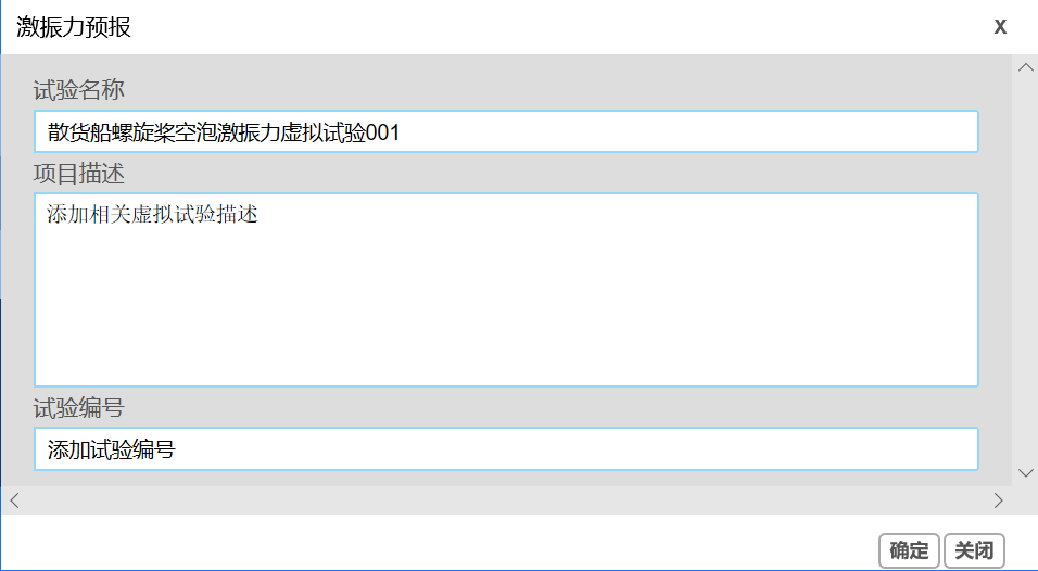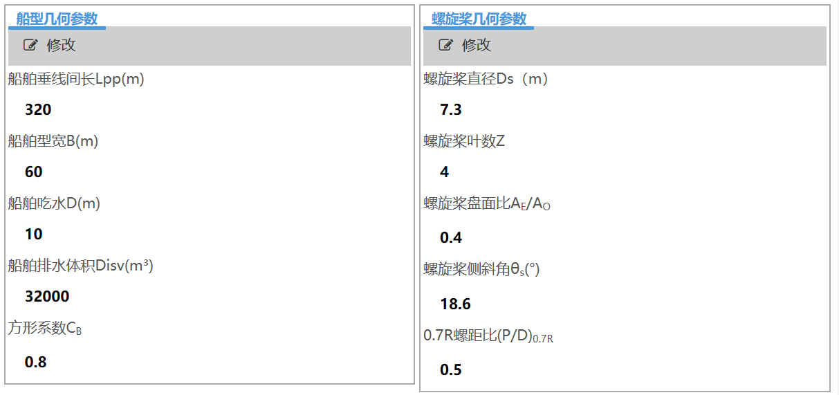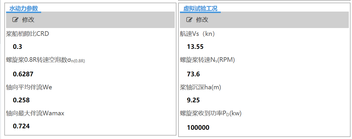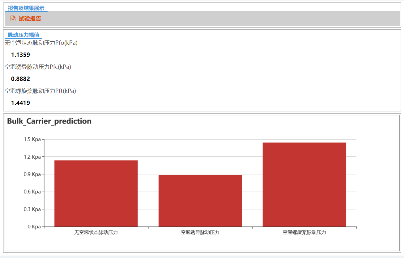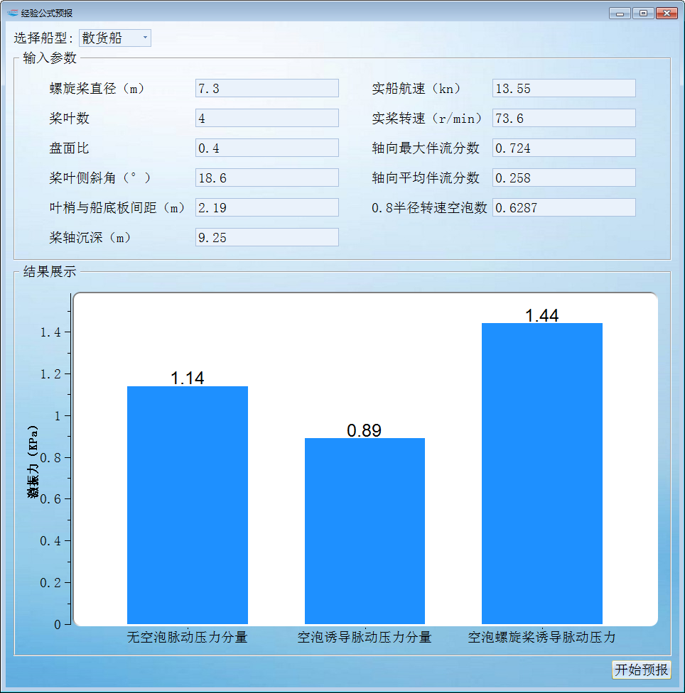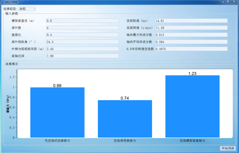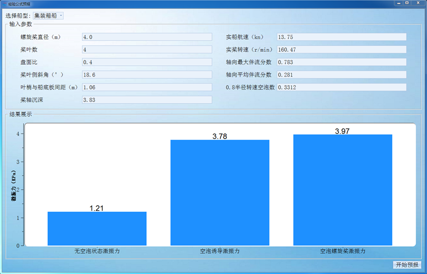 开始试验螺旋桨空泡激振力基于统计回归分析模块是利用循环水槽多年来民船螺旋桨空泡激振力试验数据,参考国外已有相关经验公式,分析现代船型激振力影响因素,在此基础上提出新的经验公式形式,基于统计回归分析的方法获得公式各项系数,获得新的螺旋桨空泡激振力预报模型。本模块可以进行散货船、油船和集装箱船的螺旋桨空泡激振力的快速预报。